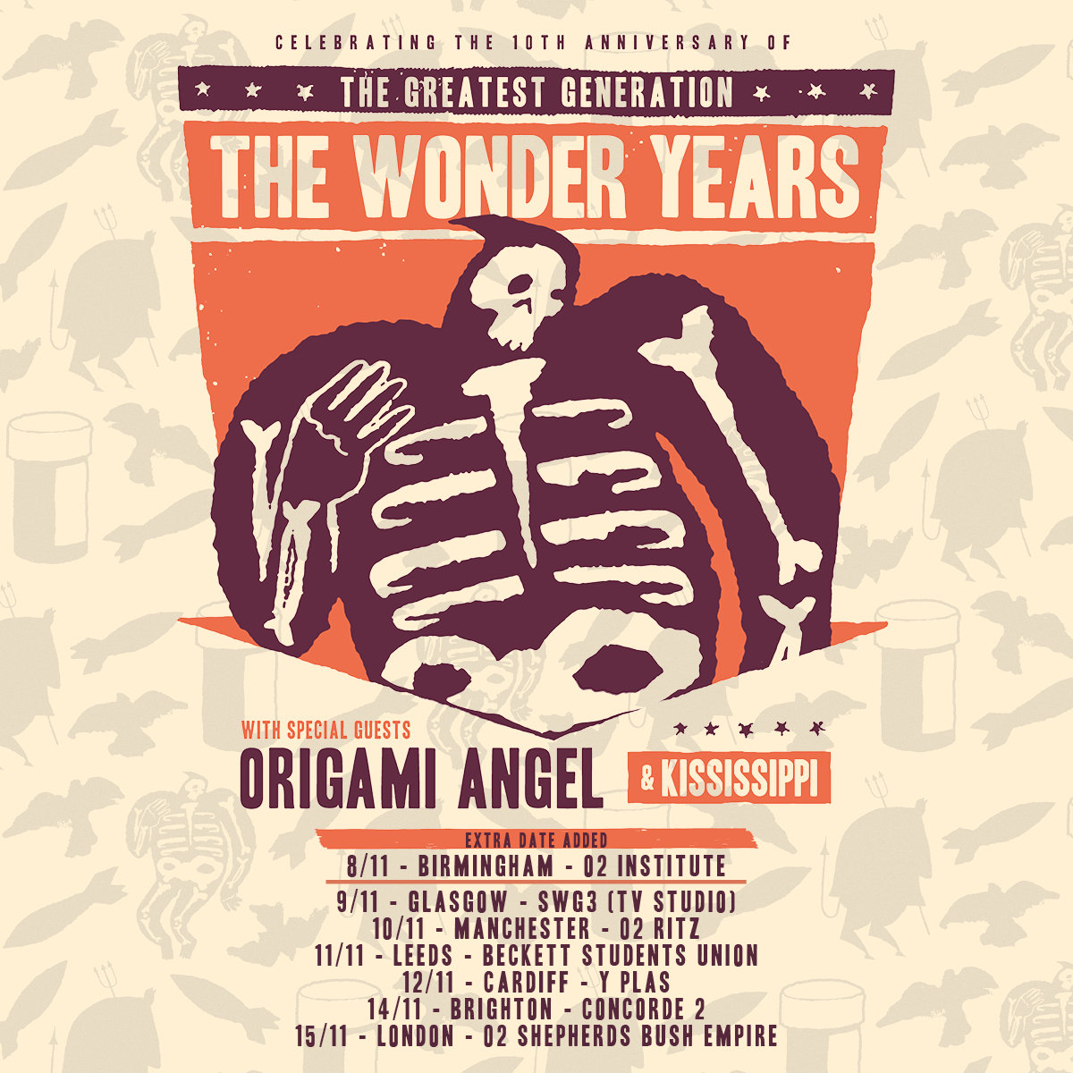 The tour forms part of the 10th anniversary celebrations of their fourth album, 'The Greatest Generation', and will also head to Glasgow, Manchester, Leeds, Cardiff, Brighton and London during November, following dates across North America earlier that fall. Tickets for those date are already on sale.