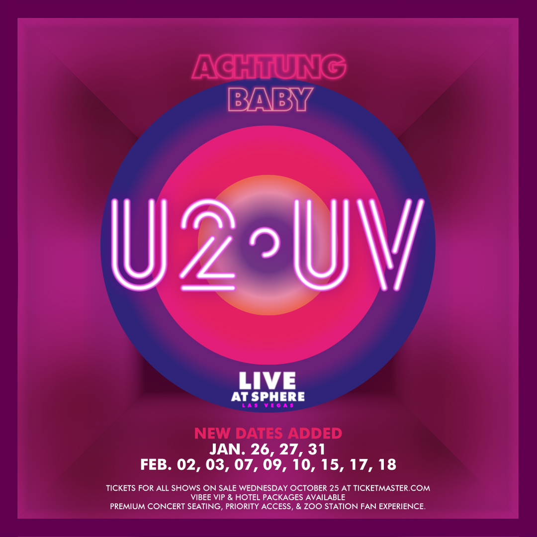 U2 have extended their U2:UV Achtung Baby Live At Sphere Las Vegas residency with 11 more dates.