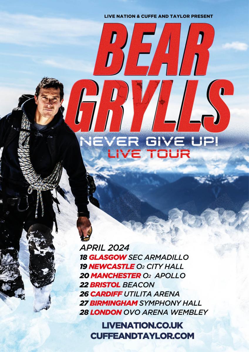 The tour shares its name with Grylls' second autobiography, Never Give Up, which came out in 2021.