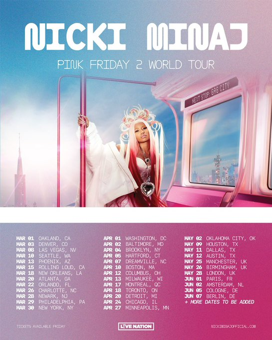 The tour shares its name with her long-awaited new album, 'Pink Friday 2', which dropped last week on Minaj's birthday (December 8). It features collaborations with Drake, Future, Lil Wayne and more.