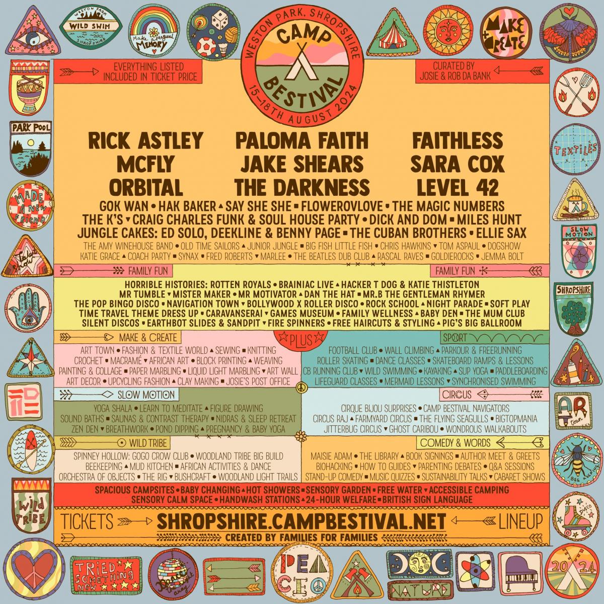 Camp Bestival Shropshire will feature headliners Faithless, Paloma Faith, and Rick Astley. Other acts set to appear include McFly, Orbital, Scissor Sisters singer Jake Shears, The Darkness, Sara Cox, and Level 42.