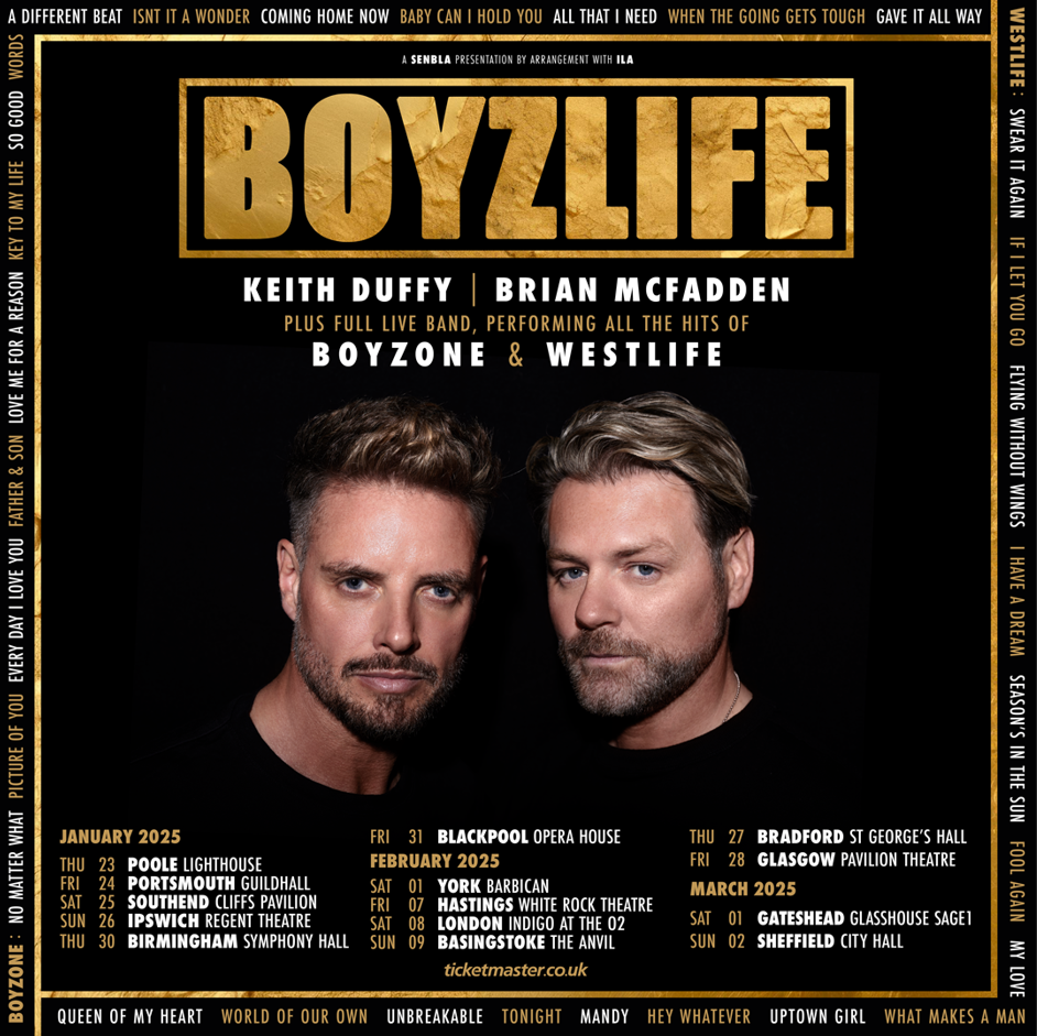 Keith Duffy and Brian McFadden will perform the hits of their respective former groups, Boyzone and Westlife, with a full live band at shows in Poole, Portsmouth, Southend, Ipswich, Birmingham, Blackpool, York, Hastings, London, Basingstoke, Bradford, Glasgow, Gateshead and Sheffield between January 23 and March 2.