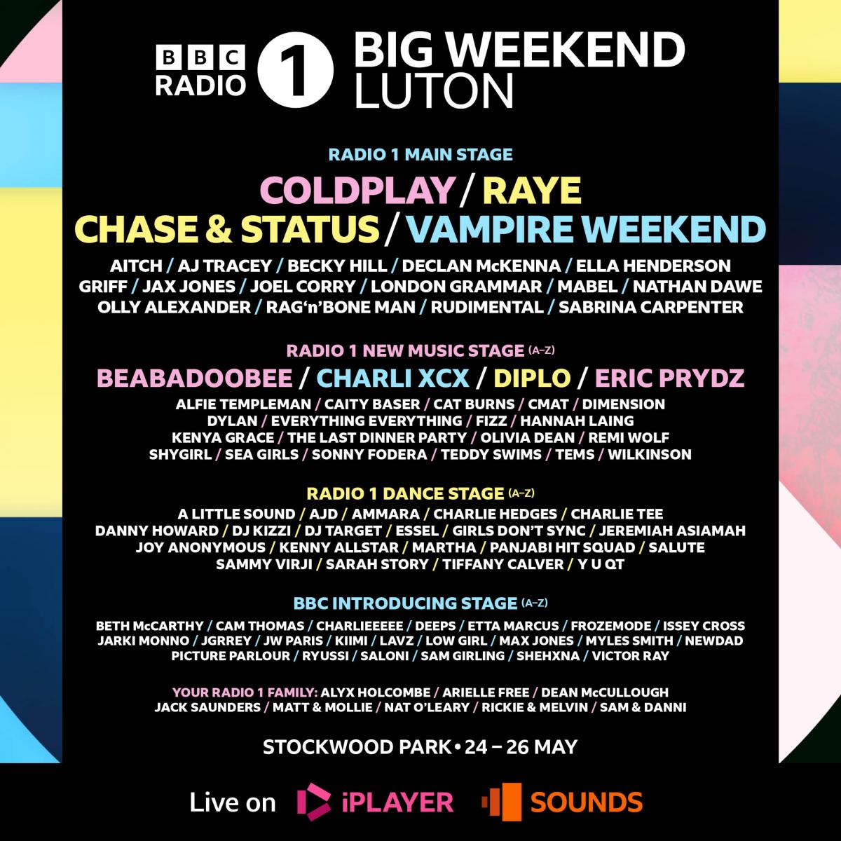 Saturday's line-up will feature Raye, Aitch, Griff, Joel Corry, Mabel, Rag'n'Bone Man, Charlie Hedges, Jack Saunders, Sam & Danni, Charli XCX, Alfie Templeman, Caity Baser, Cat Burns, Dylan, The Last Dinner Party, Shygirl, Tems, Charlie Tee, DJ Target, Jeremiah Asiamah, Kenny Allstar, Panjabi Hit Squad, Cam Thomas, Issey Cross, Jarki Monno, Kiimi, Myles Smith, NewDad, Ryussi, Saloni, and Jax Jones.