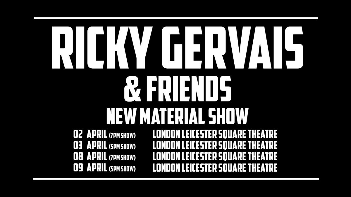 Ricky Gervais & Friends: New Material Show will return to London’s Leicester Square Theatre on April 2, 3, 8 and 9. Tickets go on general sale at 10am tomorrow (March 28).