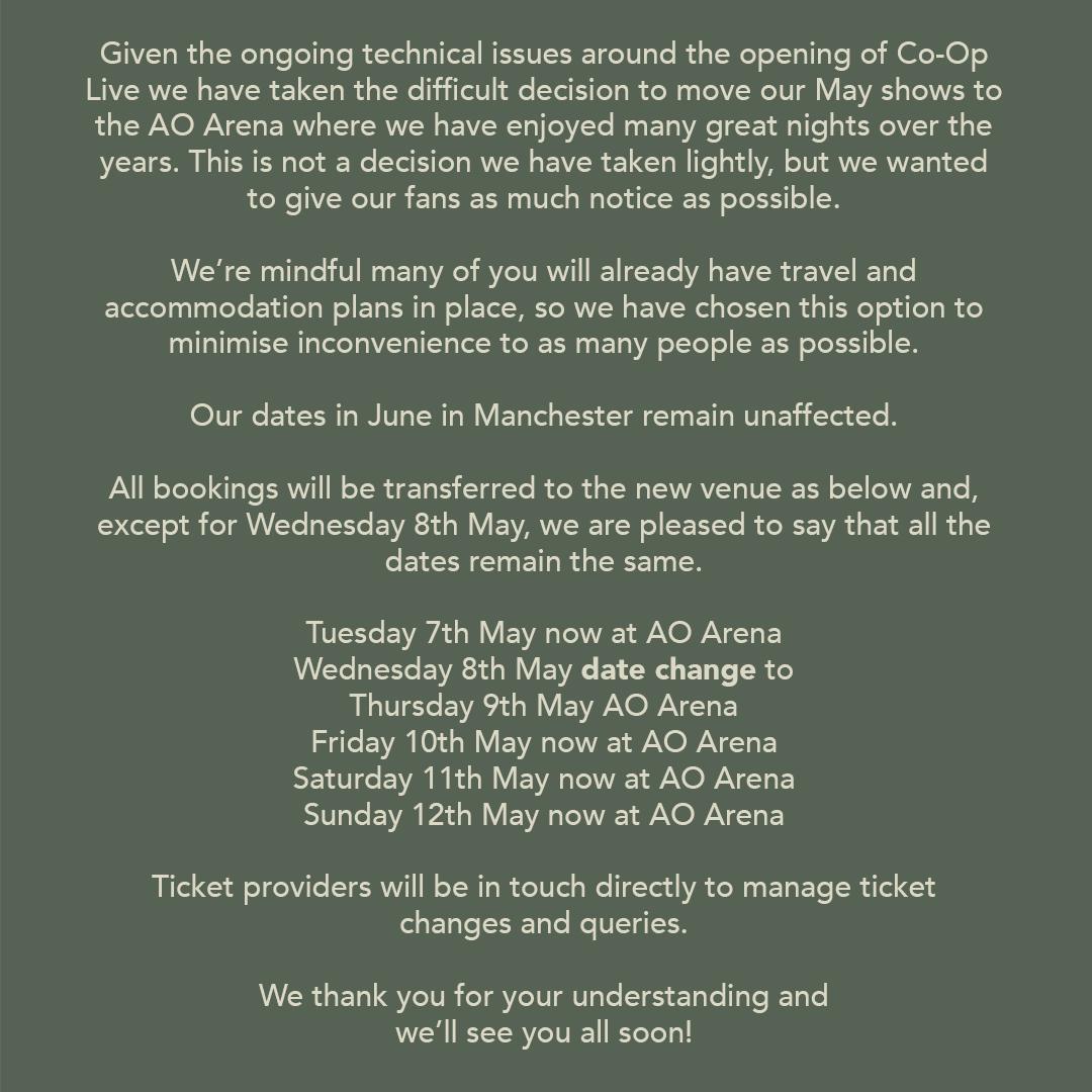 Due to "the ongoing technical issues" at the Co-op Live Arena, the concerts will now take place on May 7, 9, 10, 11 and 12 at the AO Arena. Ticket holders will be contacted by their point of purchase about the changes.