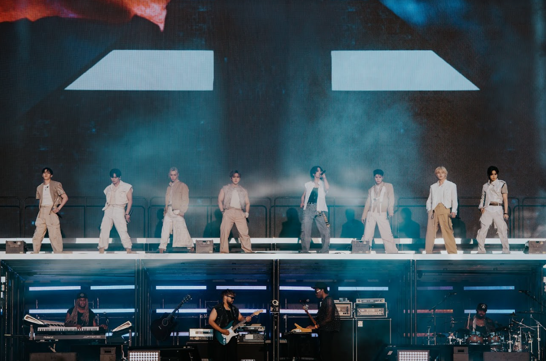 Alongside him, Lee Know, Changbin, Hyunjin, Han, Felix, Seungmin and I.N. burst onto multiple purpose built platforms from behind a huge Stray Kids banner to launch into S-Class. They work the crowd masterfully. Instead of being swallowed up by the sea of Stays, they seize their attention by covering the enormous Great Oak Stage with wave after wave of flawless, high-energy choreography accompanying the more rock-oriented songs in their discography.