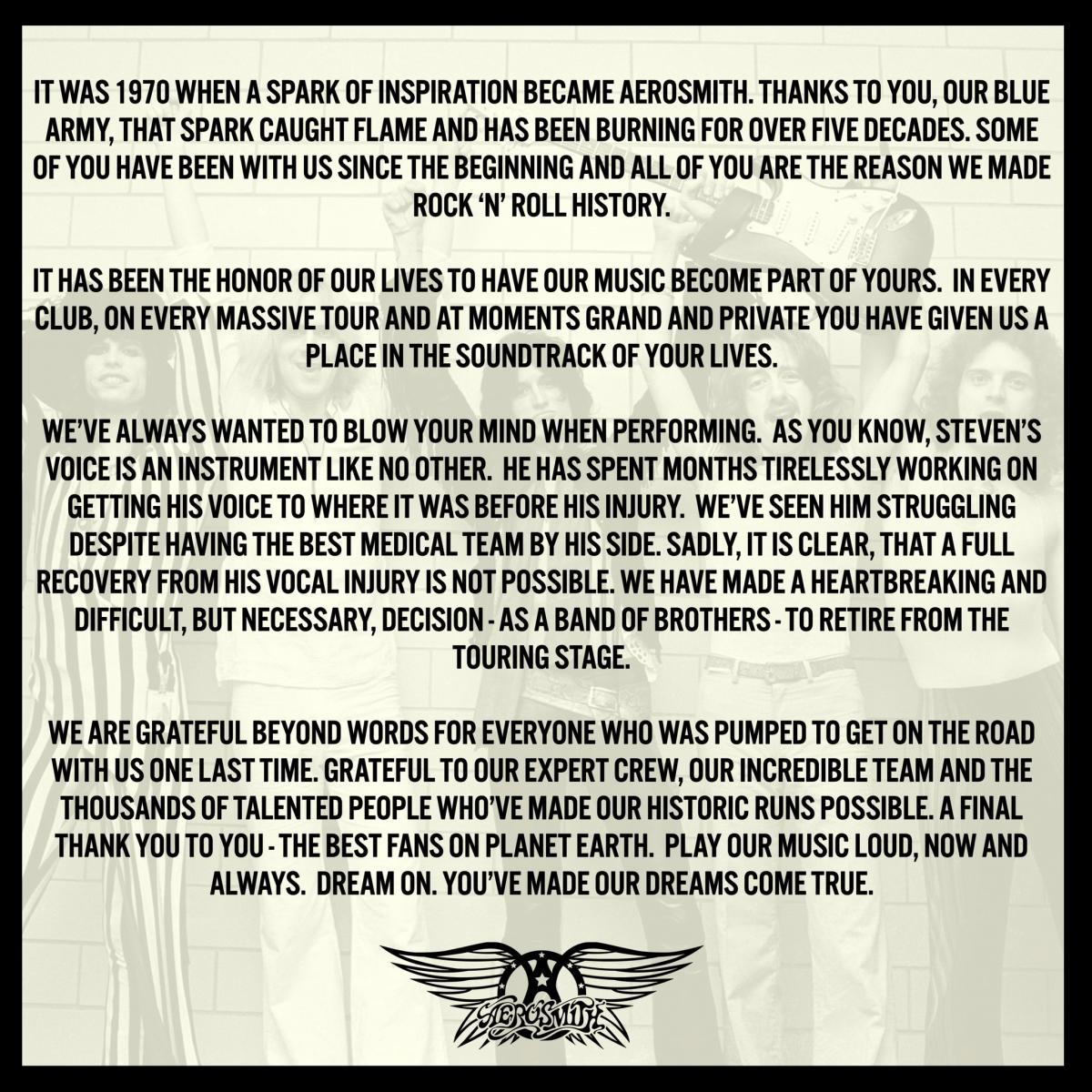 "It was 1970 when a spark of inspiration became Aerosmith. Thanks to you, our Blue Army, that spark caught flame and has been burning for over five decades. Some of you have been with us since the beginning and all of you are the reason we made rock ‘n’ roll history.