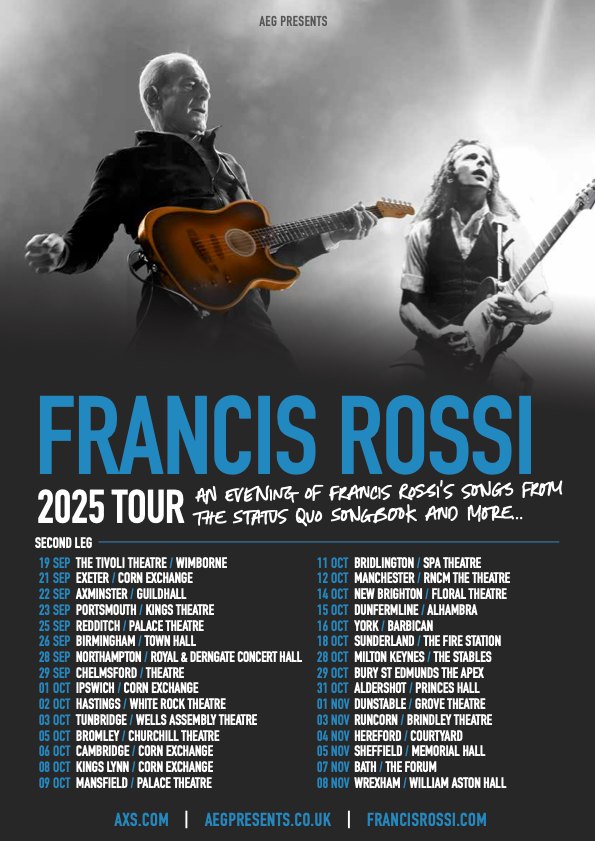 The Status Quo legend will embark on the second leg of his An Evening of Francis Rossi's Songs from the Status Quo Songbook and More Tour between September 19 and November 8 next year, calling at 30 venues across England and Wales. Tickets go on general sale at 10am on Friday (November 29).