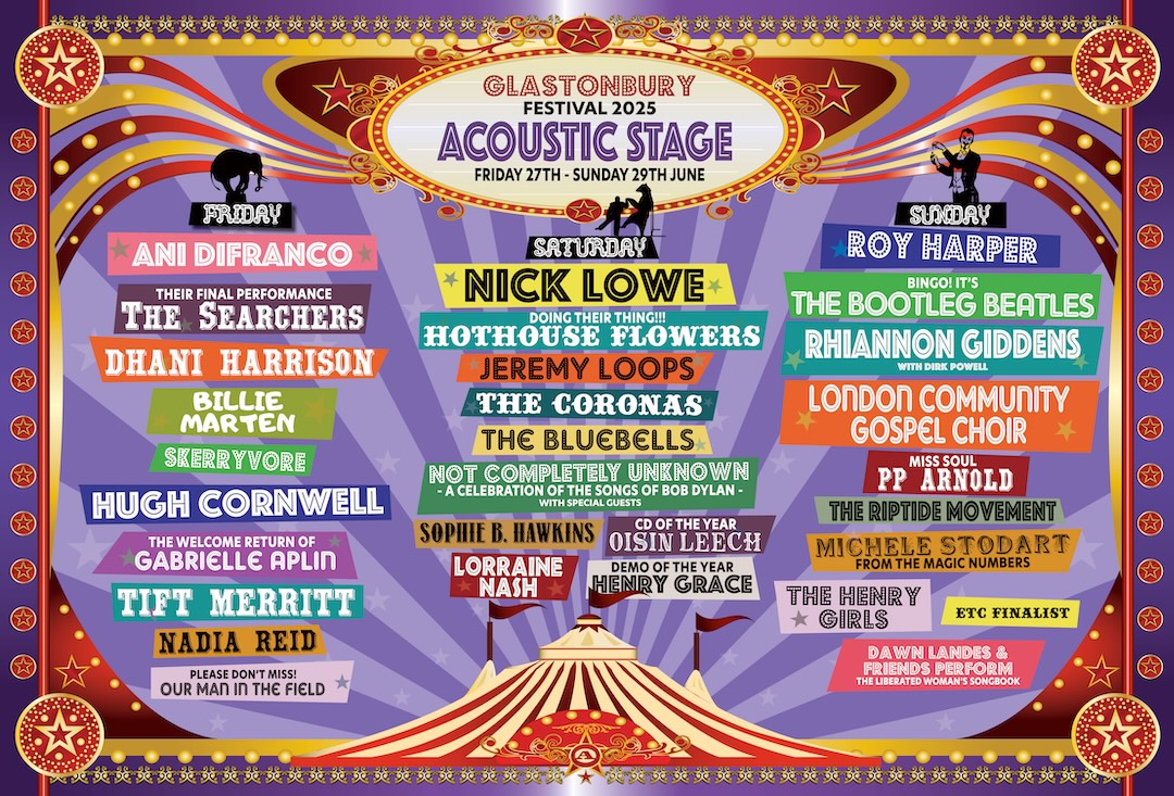 Ani DiFranco, Nick Lowe and Roy Harper will headline the Acoustic Stage on Friday, Saturday and Sunday, respectively. The line-up also features The Searchers, Billie Marten, Hugh Cornwell, Gabrielle Aplin, Nadia Reid, Hothouse Flowers, Jeremy Loops, The Coronas, The Bluebells, The Bootleg Beatles, PP Arnold, Michele Stodart, and more acts you can check out below.