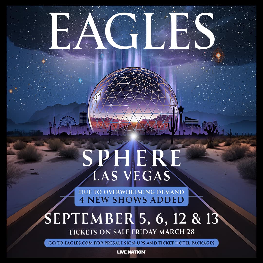 Don Henley, Joe Walsh and Timothy B. Schmit, with Vince Gill and Deacon Frey have confirmed four new shows at the Sphere on September 5, 6, 12, and 13. Tickets go on general sale at 10am local time on March 28.