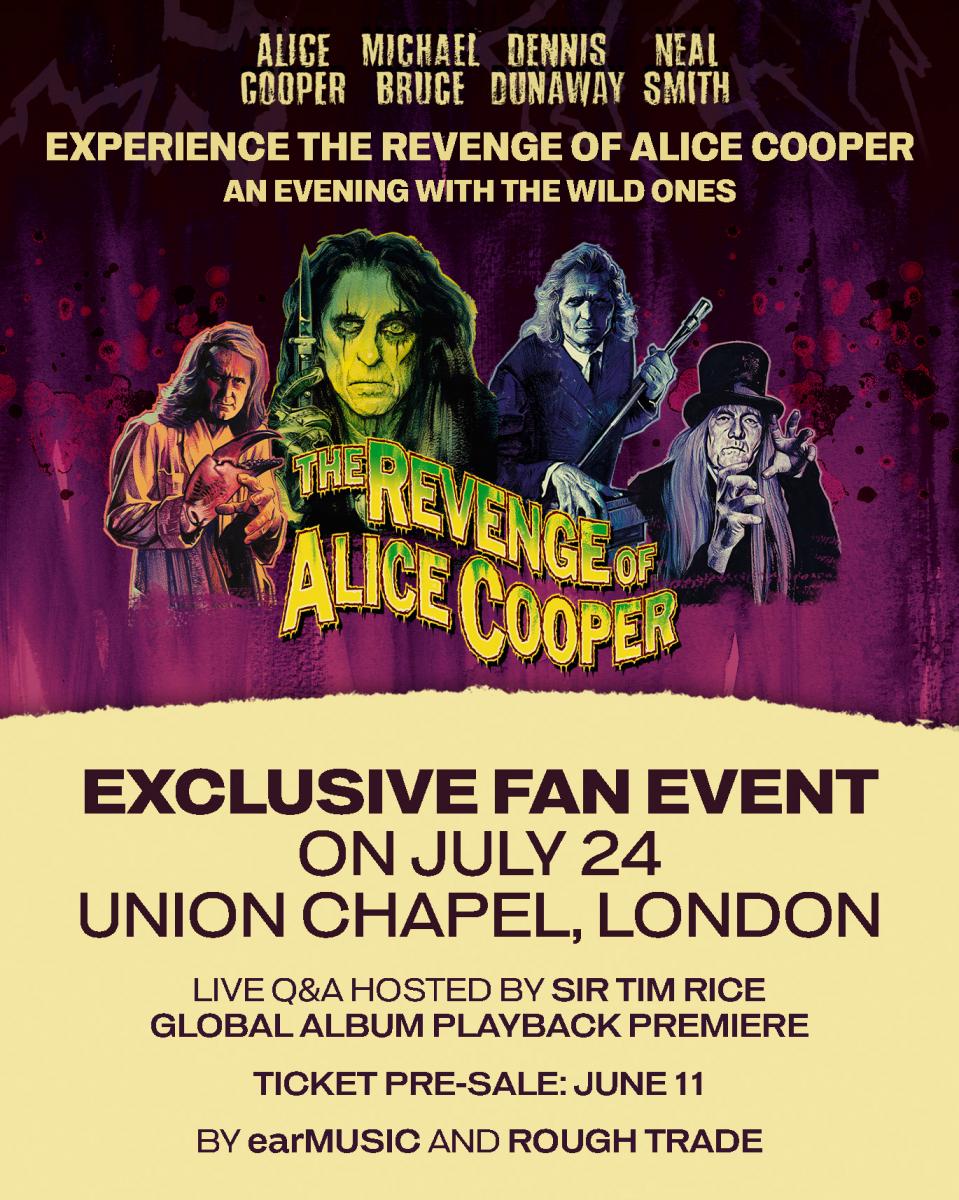 In celebration of their reunion, the four surviving members of the original Alice Cooper band—Cooper, guitarist Michael Bruce, bassist Dennis Dunaway and drummer Neal Smith — will appear for a special event at Union Chapel on July 24. The next day they'll release 'The Revenge Of Alice Cooper', their first studio album in over 50 years, which is due out on July 25.