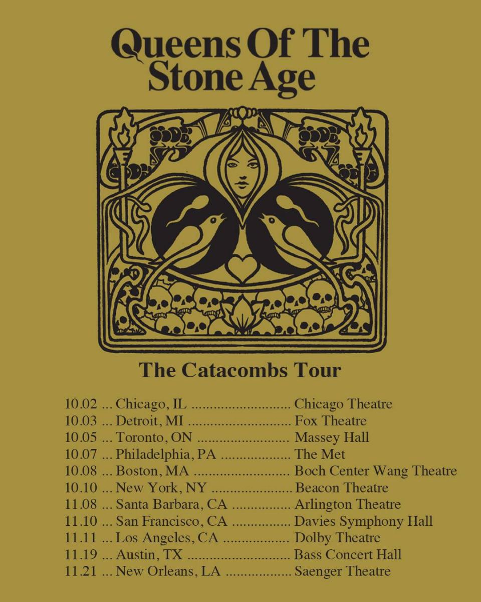 The tour is inspired by the band's new concert film, Alive In The Catacombs, which captures their performance with a string section last July in the Catacombs of Paris, where they were surrounded by millions of human remains. "The biggest audience we’ve ever played for," joked frontman Josh Homme at the time.