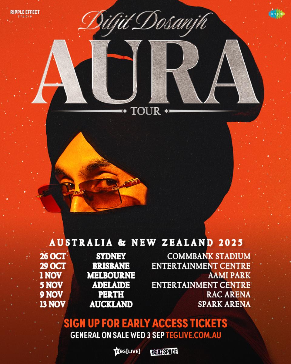 The Punjabi singer and actor will take his Aura Tour to Sydney's CommBank Stadium, Brisbane Entertainment Centre, AAMI Park in Melbourne, Adelaide’s AEC Arena, Perth's RAC Arena and Auckland's Spark Arena between October 26 and November 13.