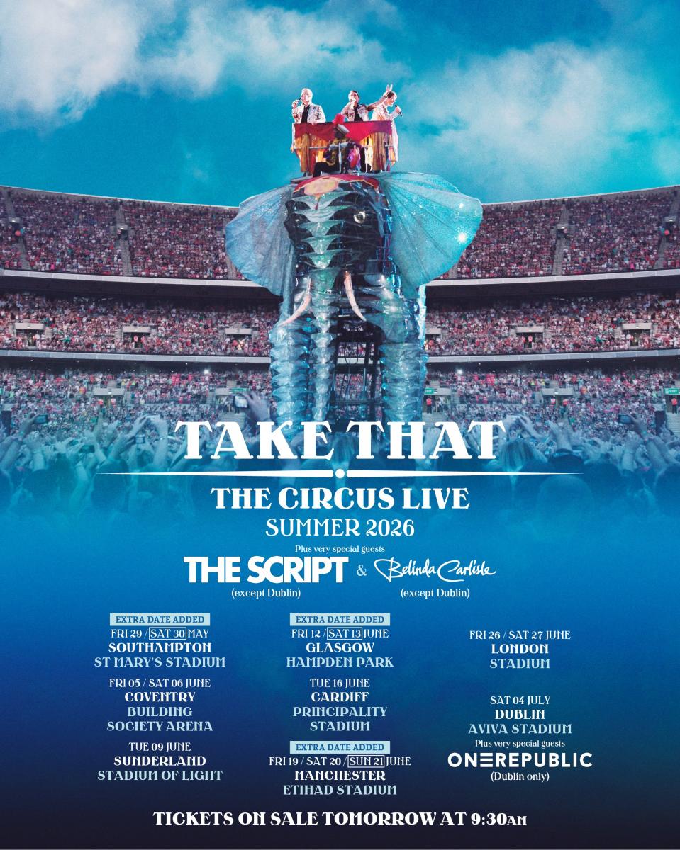 The Script, who joined Take That on the original run, will return as special guests for all UK dates, joined by pop legend Belinda Carlisle. OneRepublic will open the Dublin show.