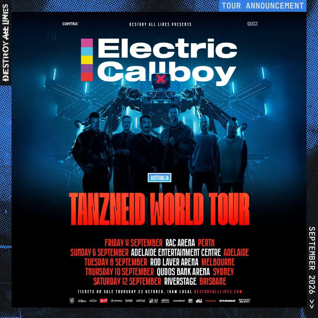 The German electronicore giants will take their Tanzneid World Tour to arenas in Perth, Adelaide, Melbourne, Sydney and Brisbane between September 4 and 12, 2026, marking their first shows in the country since their sold-out dates in 2023.