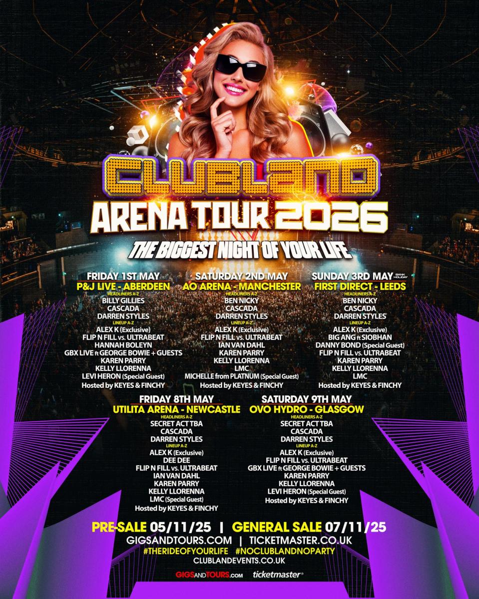 Promising 'The Biggest Night Of Your Life', the dance music extravaganza will take over P&J Live in Aberdeen, Manchester's AO Arena, Leeds' Firest Direct Bank Arena, the Utilita Arena Newcastle and the OVO Hydro in Glasgow between May 1 and 9.