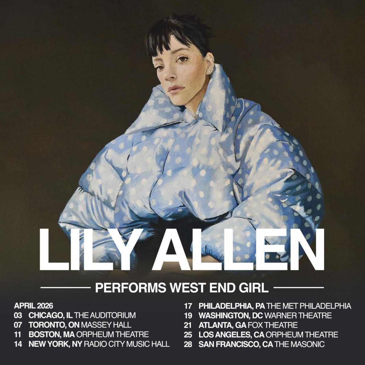 The run of dates, billed as Lily Allen Performs West End Girl, will see the returning London singer-songwriter perform her highly acclaimed new album, 'West End Girl', in its entirety across nine US and Canadian cities in the spring.