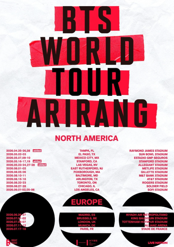 After selling out the North American and European legs of their 2026 BTS WORLD TOUR ARIRANG, the K-Pop giants have confirmed third nights at Raymond James Stadium in Tampa, Florida, and Stanford Stadium in Stanford, California, on April 28 and May 19, respectively. They've also lined up fourth show at the Allegiant Stadium in Las Vegas on May 28.