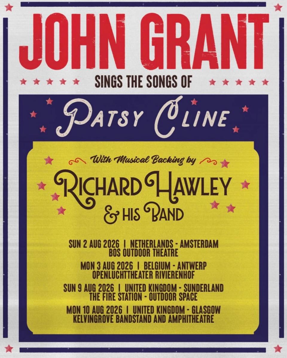 Joining the summer concert series held at Glasgow's Kelvingrove Bandstand is John Grant, who'll headline on August 10 and will be joined by Richard Hawley and his band to perform the songs of country icon Patsy Cline, which he'll also do at shows in Amsterdam, Antwerp and Sunderland on August 2, 3 and 9, respectively.