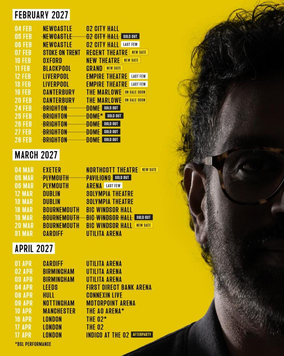 New shows have also been scattered throughout the previously announced 2027 run, including stops in Ipswich, Milton Keynes, Eastbourne, Norwich, Sheffield, Northampton and Bristol in January, Newcastle, Stoke, Oxford, Blackpool, Canterbury and Brighton in February, and Exeter and Bournemouth in March. Find them in bold below.