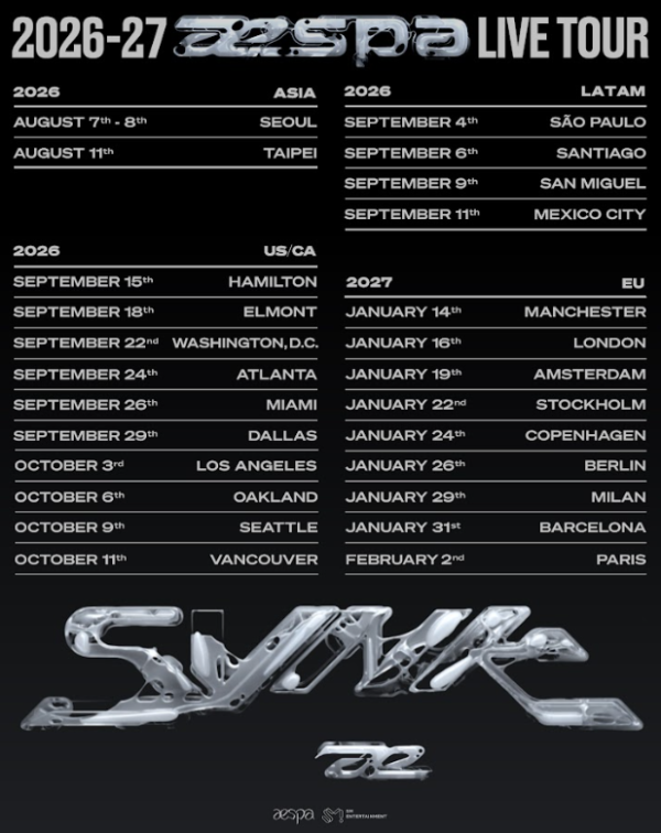 Following its release, the group — Karina, Giselle, Winter and Ningning — will embark on a world tour billed as 2026-27 aespa LIVE TOUR - SYNK : __æ____, though its full title has not been revealed yet. It'll feature stops across Asia, North America, Latin America and Europe, with the latter leg including UK shows in London and Manchester, with venue and ticket details to be revealed soon.
